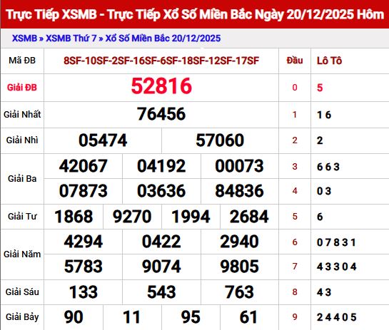 Trước khi đi vào dự đoán kết quả xổ số miền bắc ngày 21 tháng 12 năm 2025 chúng ta cùng xem lại bảng kết quả xsmb đã mở thưởng chiều qua nhé!