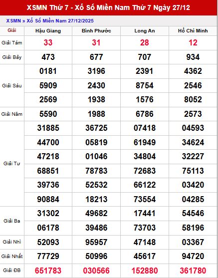 Bảng kết quả XSMN ngày 27/12 với 4 đài đài Hậu Giang, Bình Phước, Long An, Hồ Chí Minh có nhiều nhóm số nổi bật, chạm – đầu – đuôi đáng chú ý nhằm phục vụ việc dự đoán và tham khảo cho những kỳ quay tiếp theo, tạo nền dữ liệu quan trọng cho việc dự đoán xổ số miền nam ngày mùng 3 tháng 1 hôm nay.