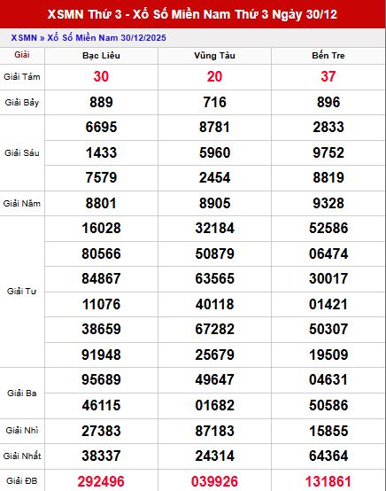 Bảng kết quả XSMN trong lần mở thưởng trước với 3 đài Bạc Liêu, Vũng Tàu, Bến Tre có nhiều nhóm số nổi bật, chạm – đầu – đuôi đáng chú ý nhằm phục vụ việc dự đoán và tham khảo cho những kỳ quay tiếp theo, tạo nền dữ liệu quan trọng cho việc dự đoán xổ số miền nam ngày mùng 6 tháng 1 hôm nay.