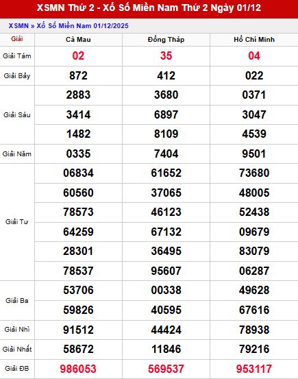 Kết quả xổ số miền Nam ngày 01/12/2025 của 3 đài Cà Mau – Đồng Tháp – TP.HCM cho thấy nhiều điểm nổi bật về đầu số, nhịp lặp và xu hướng giải đặc biệt. Dưới đây là phần phân tích nhanh, tập trung vào những tín hiệu giá trị nhất cho người chơi.